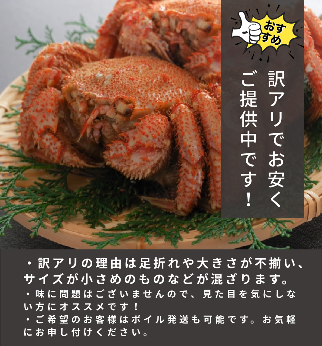 その中でも足折れ、サイズ不揃いと見た目が少し悪い蟹をお安く提供いたします。